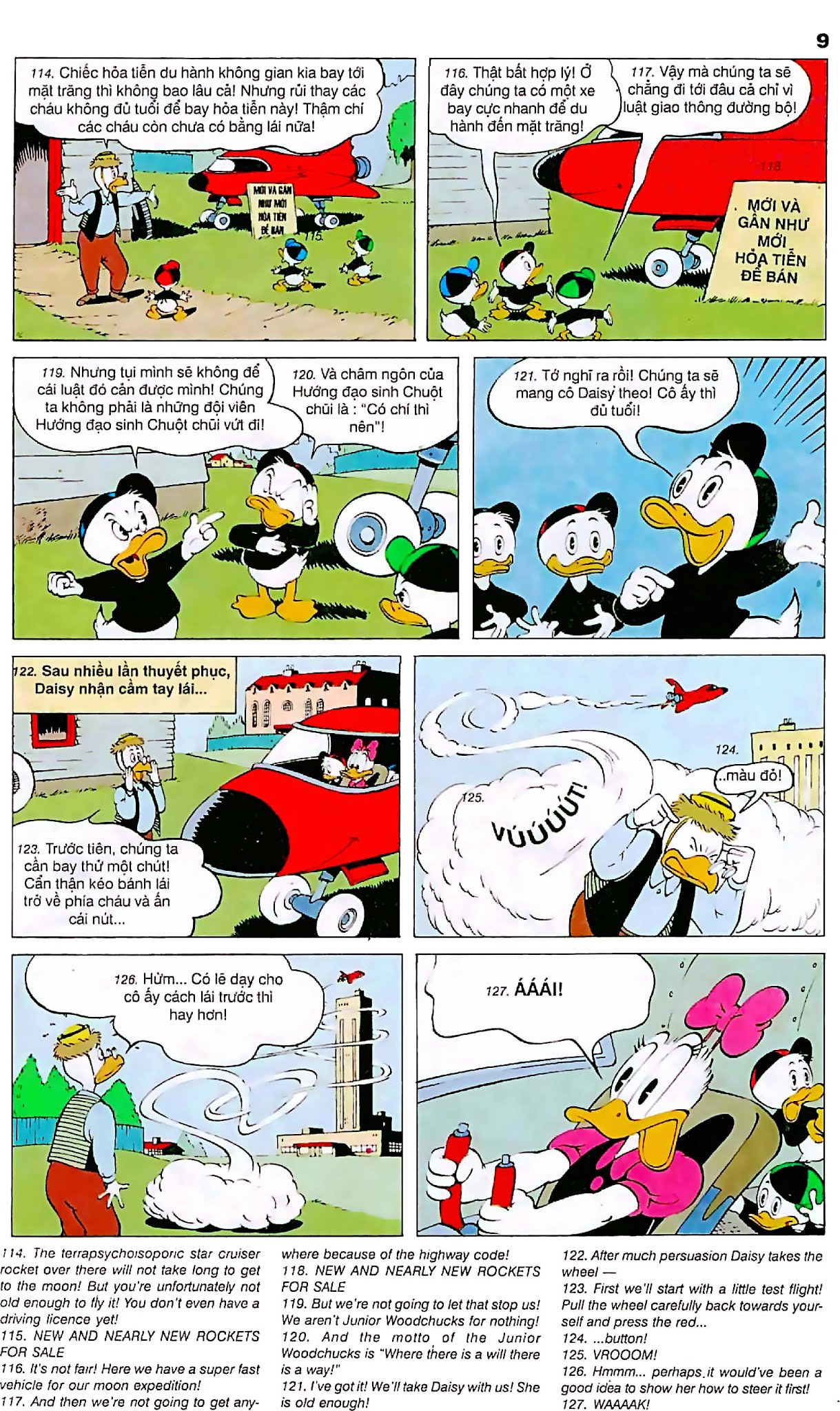 - Đáp xuống mặt trăng: Vịt Donald vô tình lên được trạm không gian trên mặt trăng nhưng bị bắt phải làm lao công, không được ra ngoài thám hiểm. Sau đó 3 người cháu bay hỏa tiễn cũng "vô tình" lên được mặt trăng